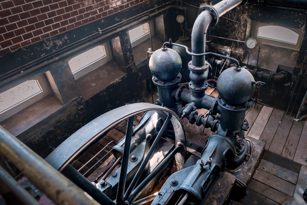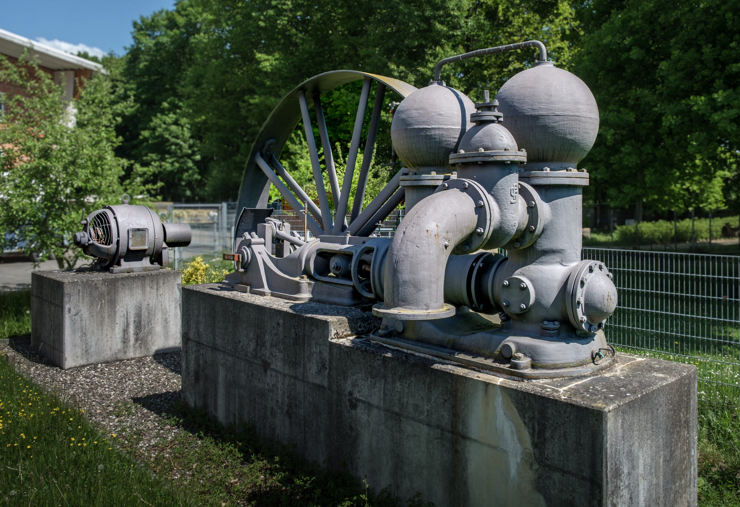 Drei Maschinen-Generationen:  hinten Doppelpumpe von 1912, in der Mitte das Schwungrad des Gasmotors von 1938 und im Vordergrund eine leistungsstarke elektrische Kreisel-Pumpe von 1970.