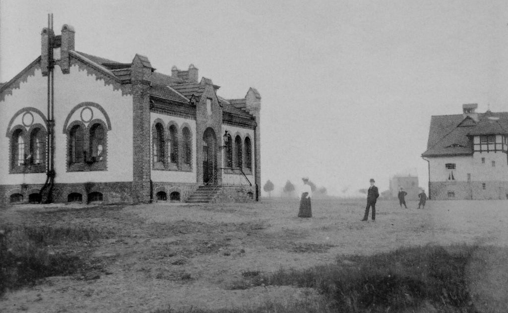 Die Gebäudehülle entstand in moderner Skelettbauweise. Die schlichten, verputzten Fassaden wurden zeittypisch durch historisierende Gestaltungselemente belebt: Hohe Zwillings- oder Drillingfenster mit Rundbögen, sowie dekorative Zierklinker-Elemente gliederten die Ansicht und verliehen dem Bauwerk eine würdige Ausstrahlung.