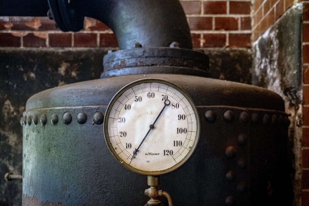 Wohlbehaltene Wasserwerkstechnik: 1: Gasmotor von 1912, 2: Wasserbehälter 3: Liegende Doppel-Kolbenpumpe von 1903.