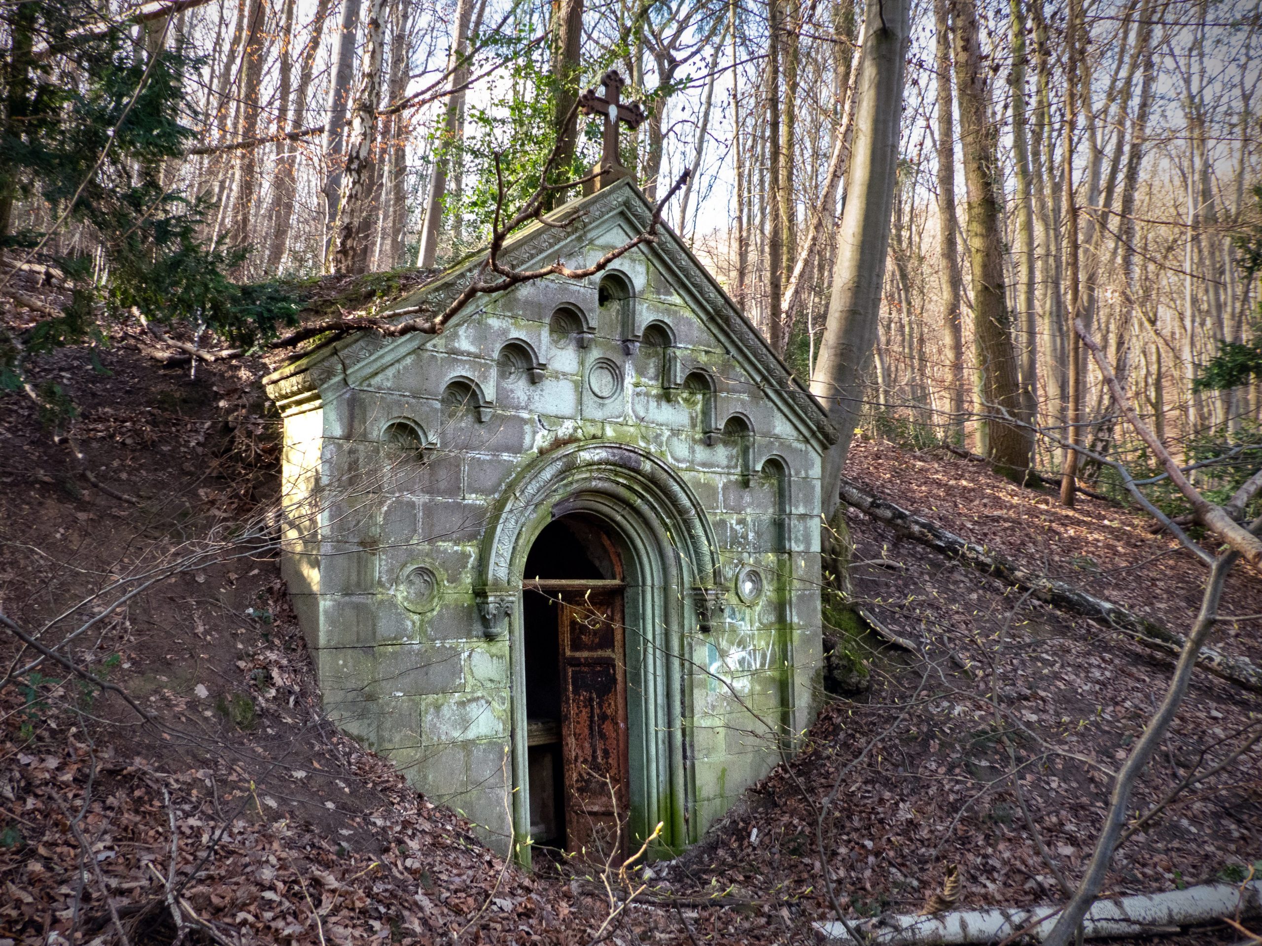 1846 folgte ein Mausoleum am damaligen Waldrand, relativ klein und schlicht – aber immerhin: ein eigenes Gebäude für die eigenen sterblichen Überreste. Offenbar hatte die Anlage auch den Anspruch, die Landschaft ansprechend zu gestalten. Es war ein elliptischer Vorplatz mit Sitzplätzen und Trauerweide geplant. Die Fassade wurde mit kunstvoller Steinhauerarbeit gestaltet und ist heute noch gut erhalten. Die gusseisernen Türen, von denen eine noch zu sehen ist, zeigen im oberen Bereich einen Schmetterling – ein Symbol für die entschwebende Seele. Köhler wurde hier auch später beigesetzt.