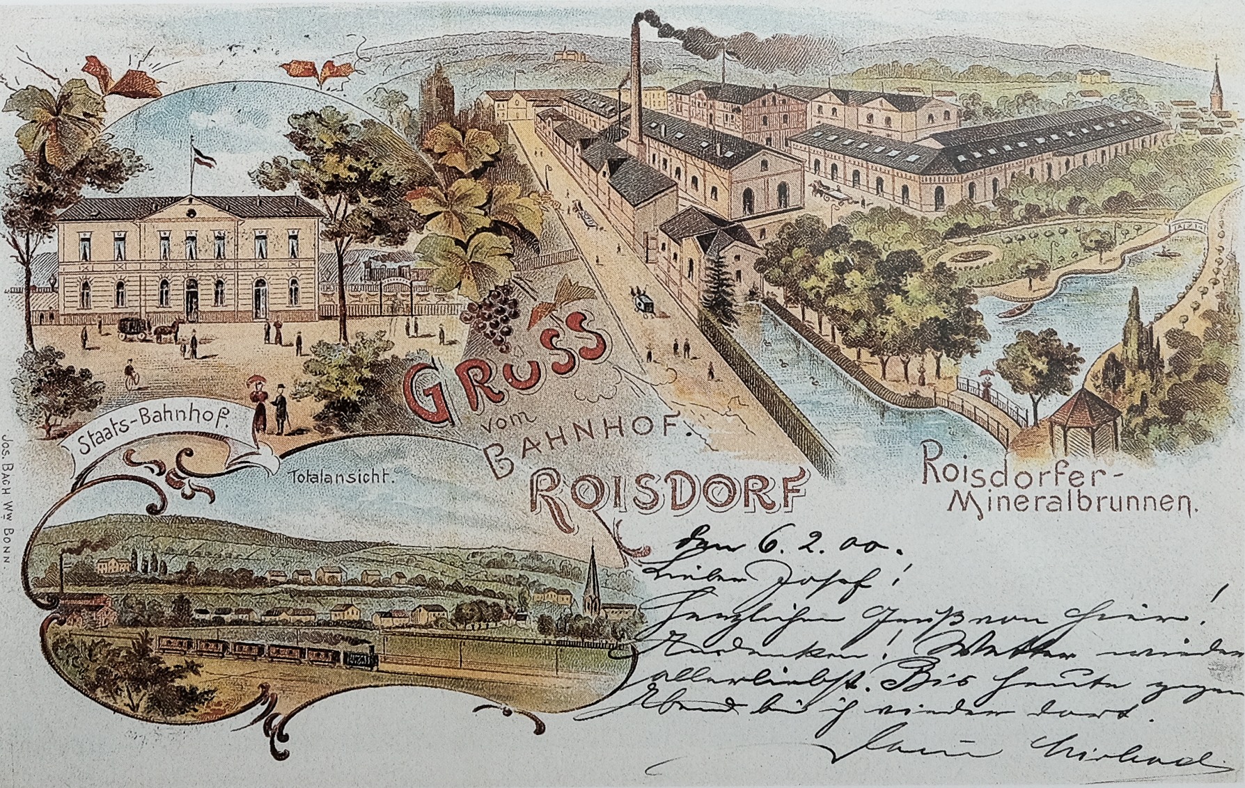 Um 1900 sind der Brunnen-Park und das großflächige Gebäudeensemble der Mineralwasserabfüllung an der Brunnenallee erkennbar. Die Karte zeigt auch den repräsentativen Bahnhof, der in der Fluchtlinie der Brunnenallee stand, aber später abgerissen wurde, Postkarte 1899. Herbert Weffer: Westlich von Bonn, Bonn 2000, S. 17.