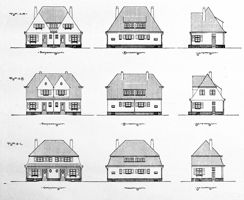 Eine individuelle Anmutung erhielten die Typenhäuser vor allem durch abwechslungsreiche Dachformen, die Bezug auf historische Vorbilder nehmen und eine dörflich-kleinstädtisch anmutende Atmosphäre vermitteln. Die Gestaltung der Siedlung folgt den Ideen der zeitgenössischen Reformarchitektur, die auf Schlichtheit und Einfachheit Wert legt und sich auf traditionelle Bauweisen bezieht.