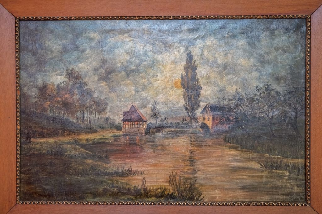 Ölgemälde der Sieglarer Mühle, vor der Erweiterung in der zweiten Hälfte der 19. Jahrhunderts. Das frühere Mühlengebäude rechts ist bis heute erhalten. Unbekannter Künstler, Exponat in der Ausstellung „200 Jahre Mannstaedt“ im MUSIT (2025).