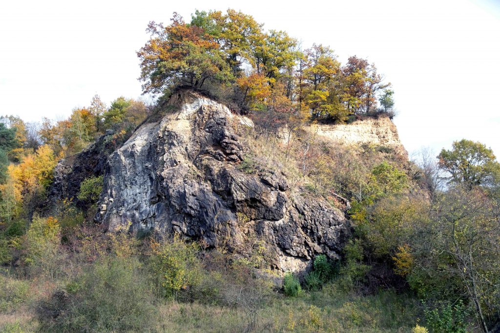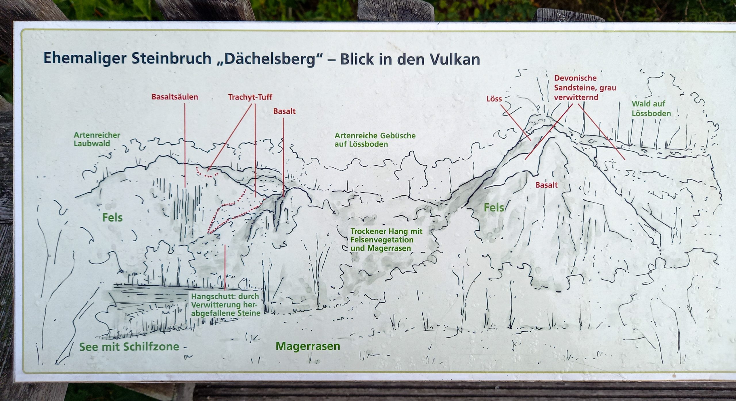 2015 entstand ein Aussichtsturm mit Informationstafeln des Naturparks Rheinland, der aus der Vogelperspektive einen weiten Blick in das Steinbruchgelände und Biotop bietet. Der ehemalige Vulkan ist durch den Steinabbau „lehrbuchartig“ in der Mitte geöffnet, sodass man einen Einblick in das Innere erhält. Die deutlich sichtbaren Basaltsäulen markieren das Zentrum des ehemaligen Vulkans (siehe Titelbild).