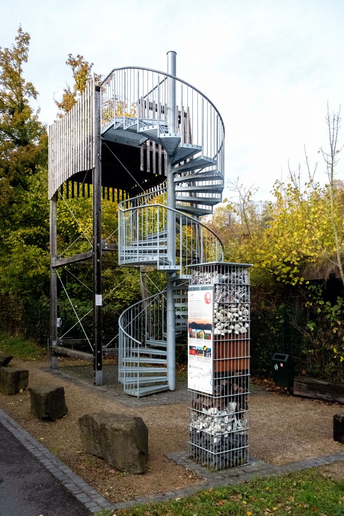 Aussichtsturm und Informations-Stele des Naturparks Rheinland am Steinburch Dächelsberg. An den Infosäulen kann man Gesteinsproben entnehmen, hier zum Beispiel: Basalt.