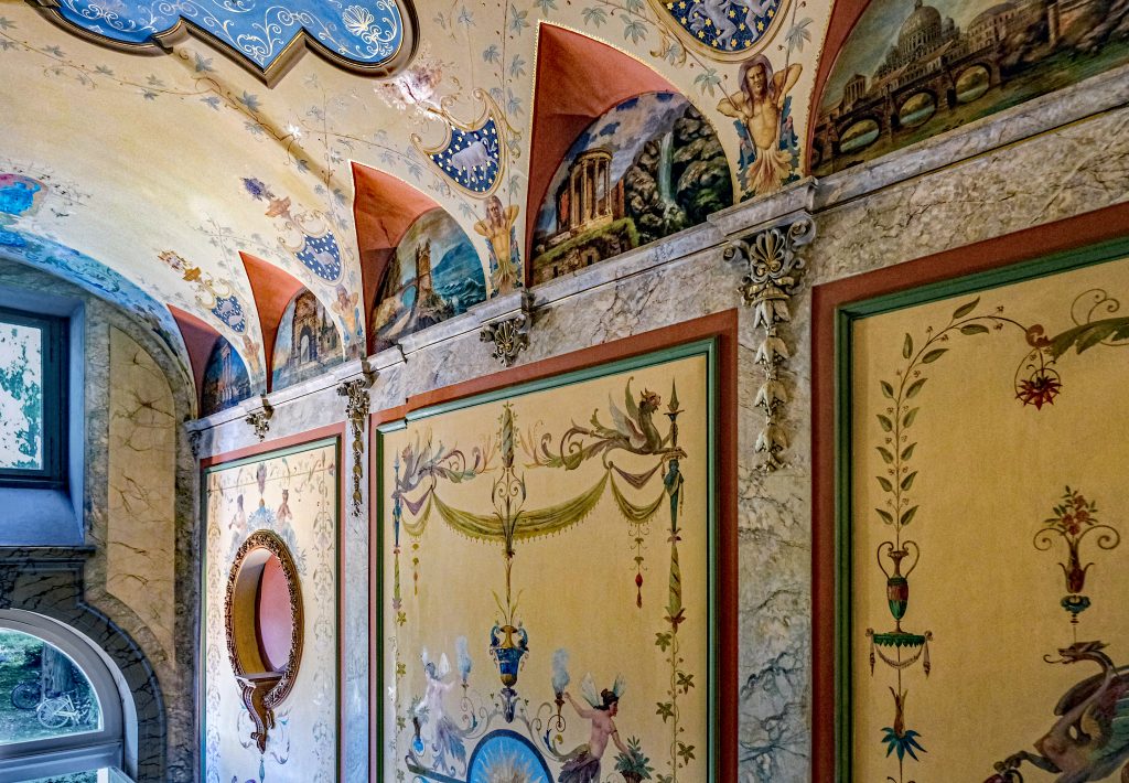 Spektakulär ist die Gestaltung des Treppenhauses (nicht öffentlich zugänglich), in dem eine Marmortreppe in die Belle Etage führt . Die Seitenwände und die Decke des über sechs Meter hohen Raums sind aufwändig im historischen Stil bemalt. Besonders ins Auge fallen die heroisierenden Darstellungen eines Bergmanns und eines Schmiedes – ein Bezug auf die Friedrich-Wilhelms-Hütte. Sie sind umgeben von Pflanzenornamenten, antiken Motiven und Sternzeichen, Fabelwesen und Naturgöttern.