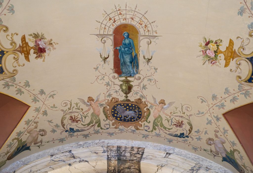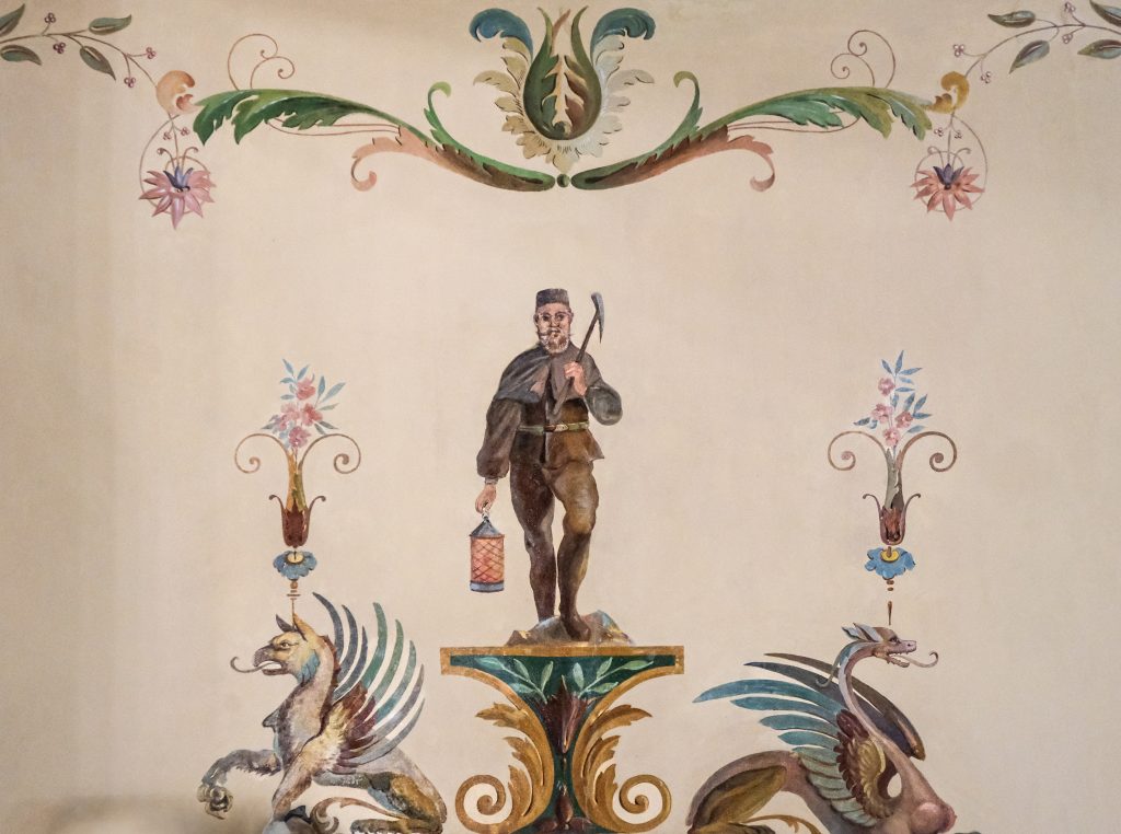 Darstellungen eines Bergmannes und eines Schmiedes sowie einer Allegorie der Technik – mit Zahnrad und Zirkel, Treppenhaus der Villa Langen.