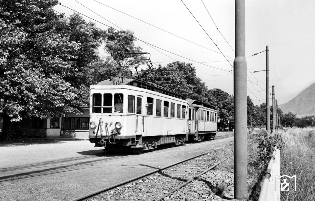 1957 warten Triebwagen 27 und Beiwagen 61 der „Siebengebirgsbahn“ in Honnef auf neue Fahrgäste; links von hohen Bäumen beschattet die moderne Wartehalle. Foto: Aad van Ooy. Archiv Stiftung Eisenbahngeschichte Joachim Schmidt.
