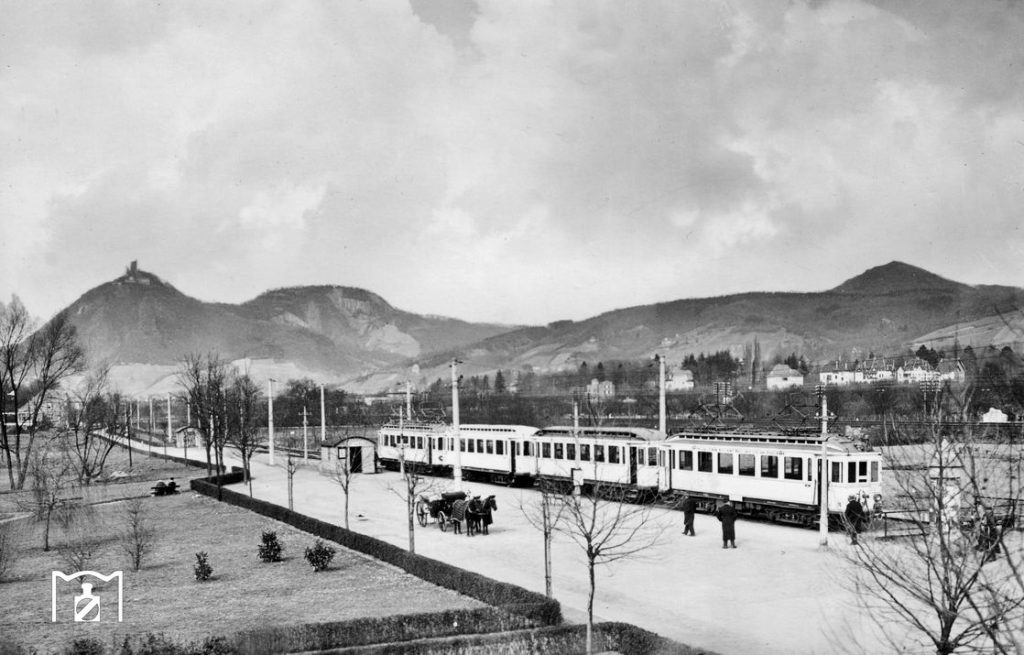 Ein langer Triebwagenzug mit dem Triebwagen 16 an der erst vor wenigen Jahren parkähnlich gestalteten Endhaltestelle in Honnef; im Hintergrund das Siebengebirge mit dem Drachenfels. Foto: Carl Bellingrodt. 1937. Archiv Stiftung Eisenbahngeschichte Joachim Schmidt.