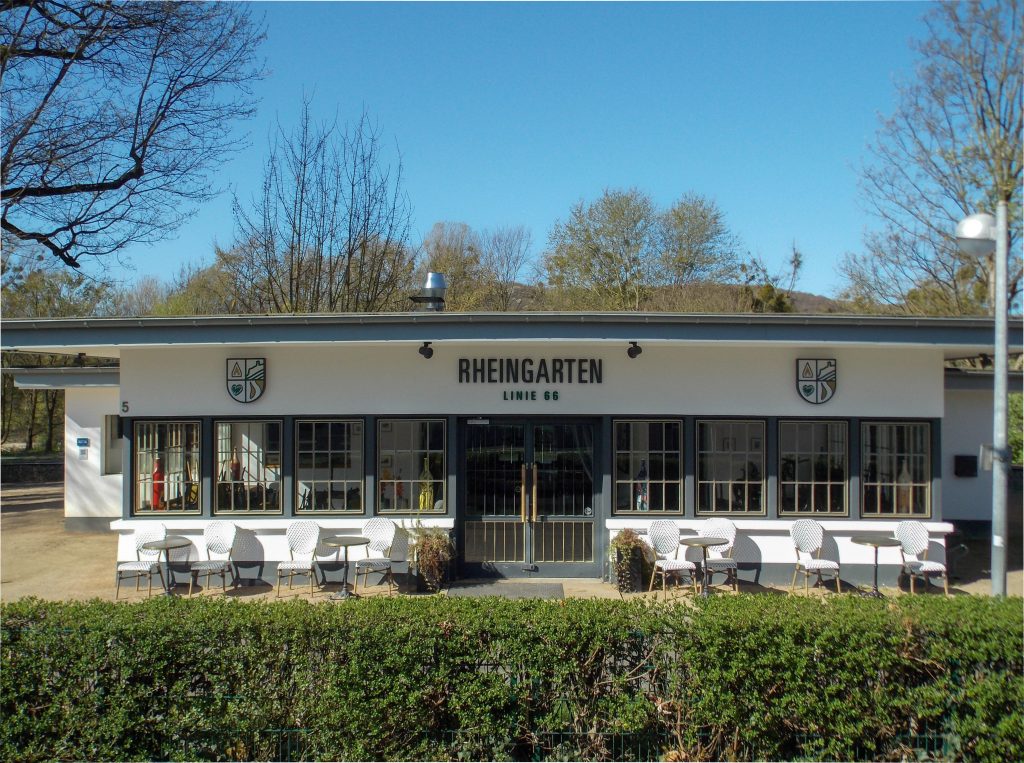 Als nach dem Zweiten Weltkrieg der Ausflugsverkehr wieder an Fahrt gewann, genügte der alte Wellblechwarteraum nicht mehr den gestiegenen Ansprüchen im selbsternannten „Nizza am Rhein“: Die 1949/50 komplett neu errichtete Wartehalle bot den Fahrgästen einen weitaus angenehmeren Aufenthalt. Der Entwurf des schlichten Gebäudes stammte von dem renommierten Bonner Architekten Wilhelm Denninger (1899-1973), der sich in den Folgejahren in der jungen Bundeshauptstadt vor allem mit Büro-, Verwaltungs- und Geschäftshäusern, aber auch mit verschiedenen Wohngebäuden einen Namen machen sollte.