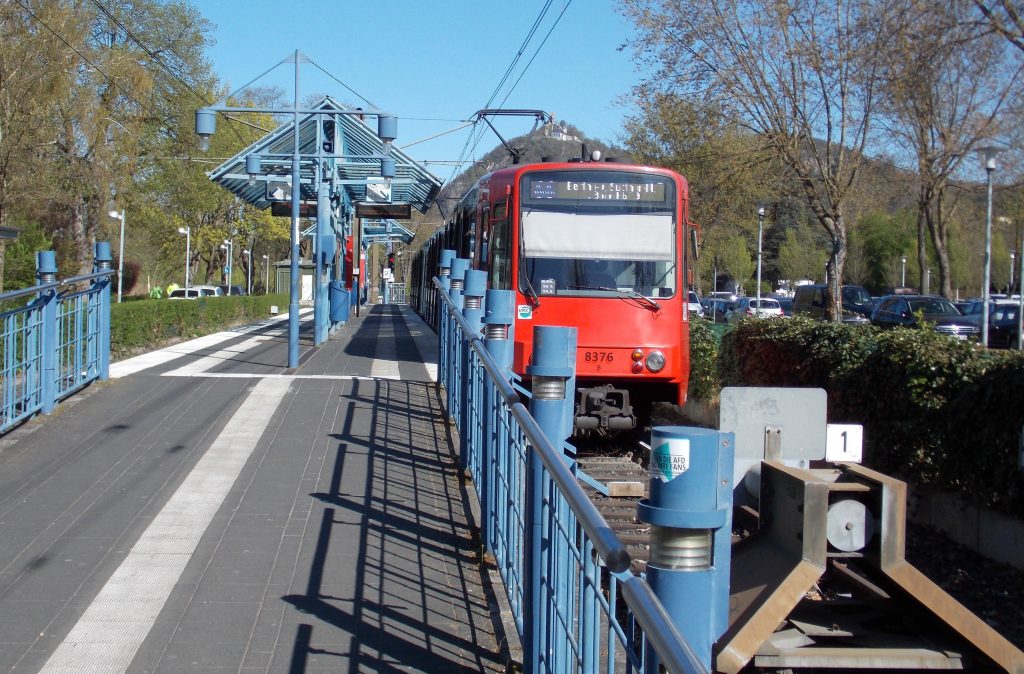 Die Stadtbahnlinie 66 an der Endhaltestelle, mit dem Drachenfels im Hintergrund.
